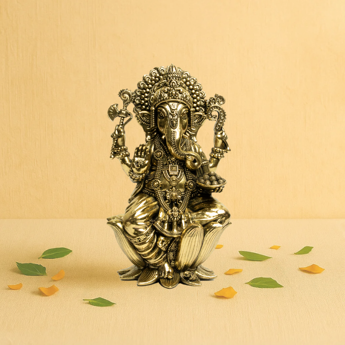 This exquisite brass idol portrays Lord Ganesha seated gracefully on a blooming kamal (lotus)—a divine symbol of purity rising above worldly attachments. Ganesha, the Vighnaharta (remover of obstacles), holds a modak, axe, lotus, and blessings in each hand—each gesture narrating a sacred story.
