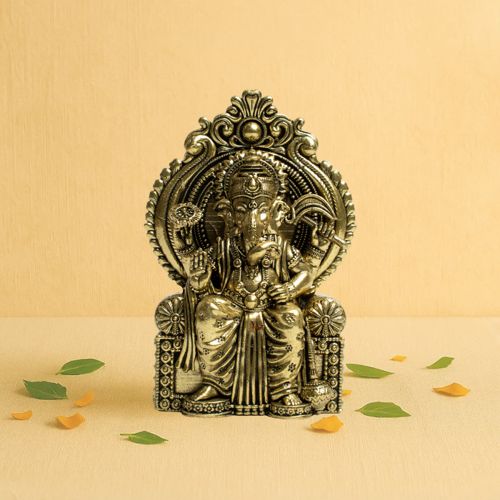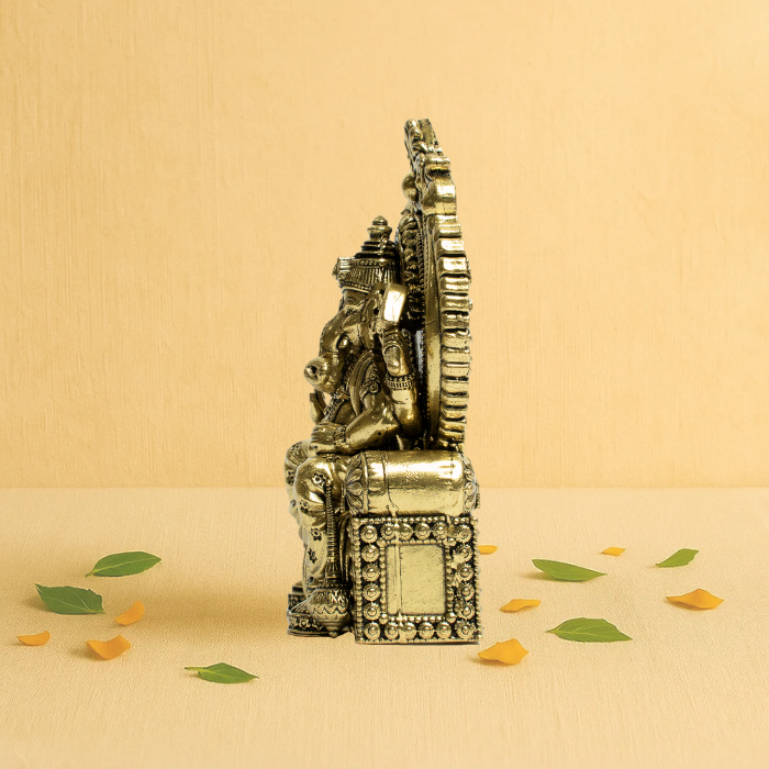 This majestic Ganesha idol, seated on an ornate throne with an intricately designed arch, represents royalty, wisdom, and divine protection. Lord Ganesha, the remover of obstacles and god of beginnings, is worshipped before any auspicious work. His throne signifies his authority over intellect and success.